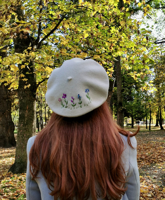 Beretă crem brodată manual cu flori