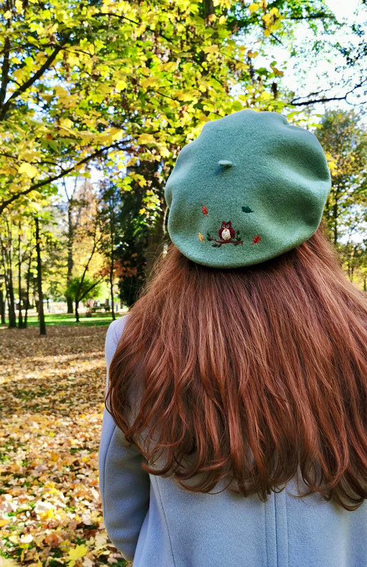 Beretă verde deschis cu bufniţă şi frunze