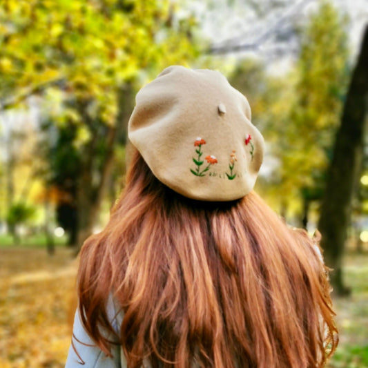 Beretă camel brodată cu flori