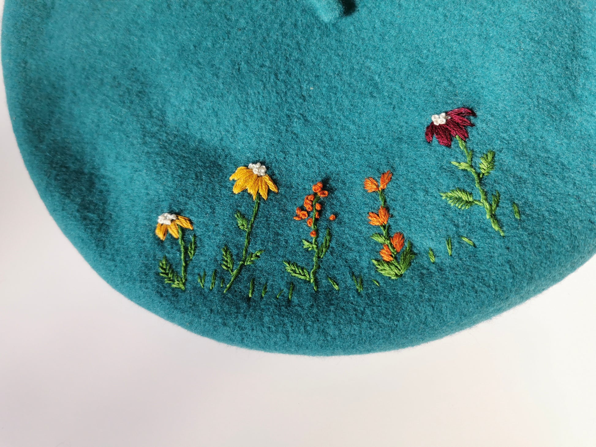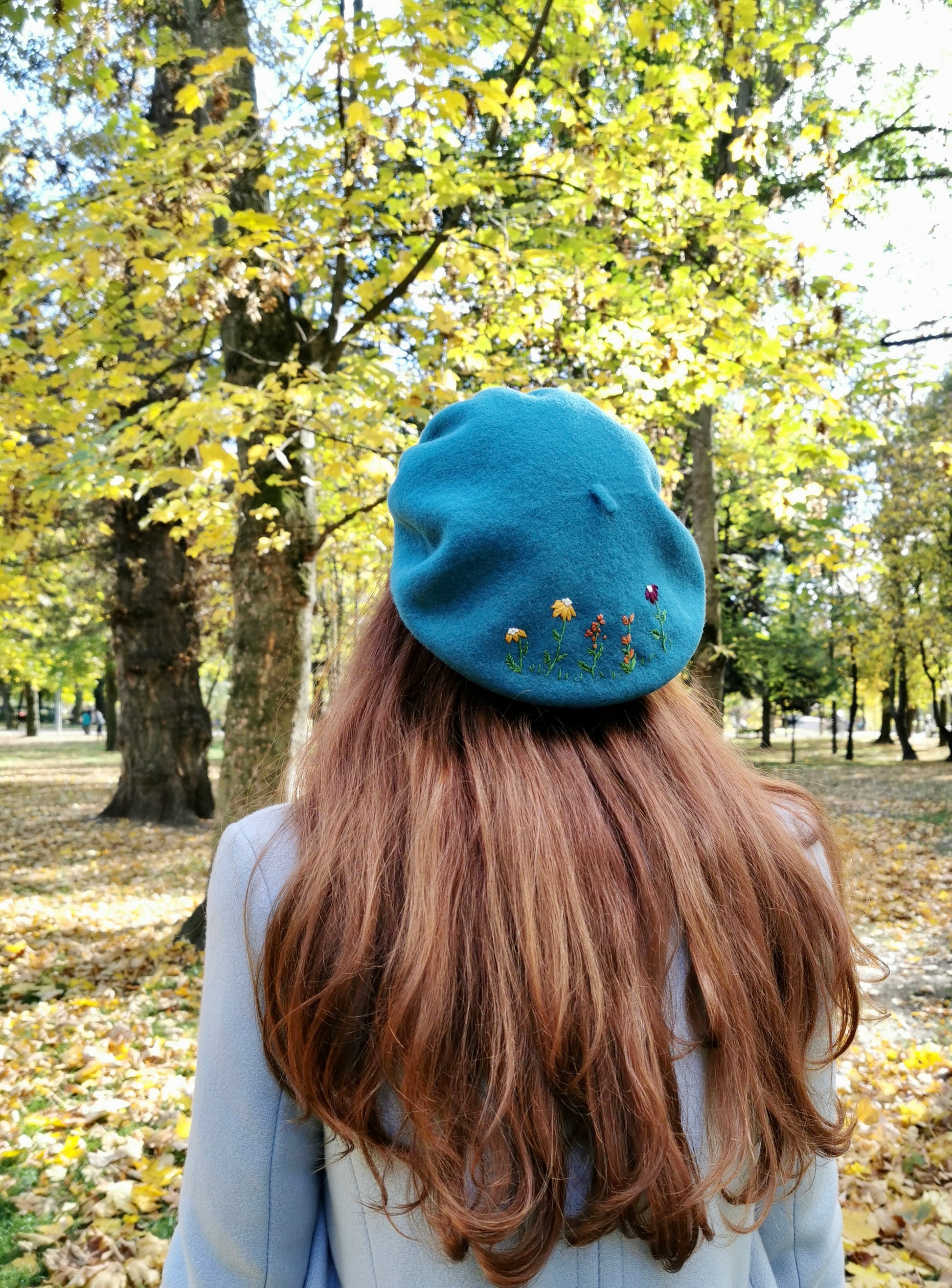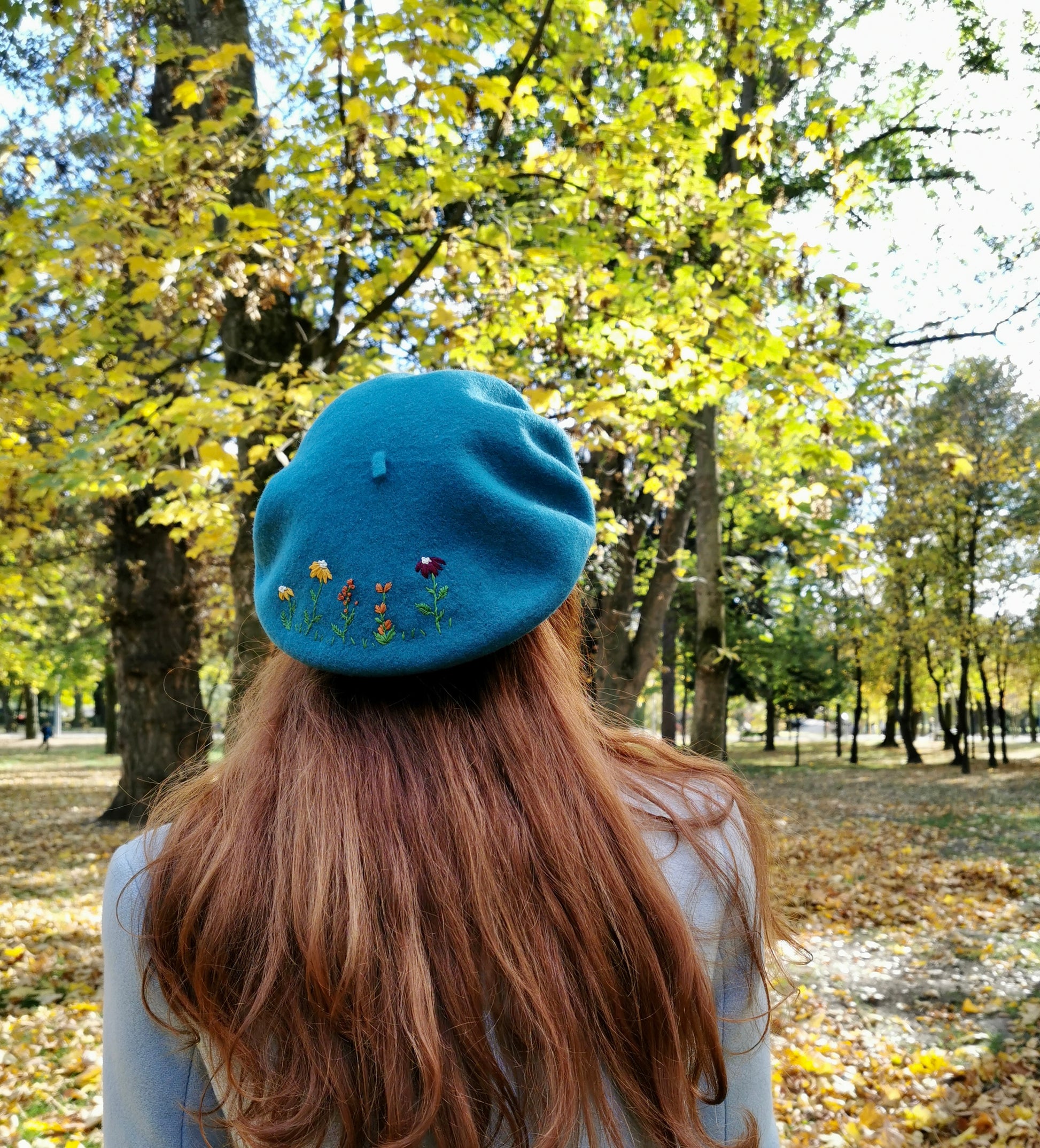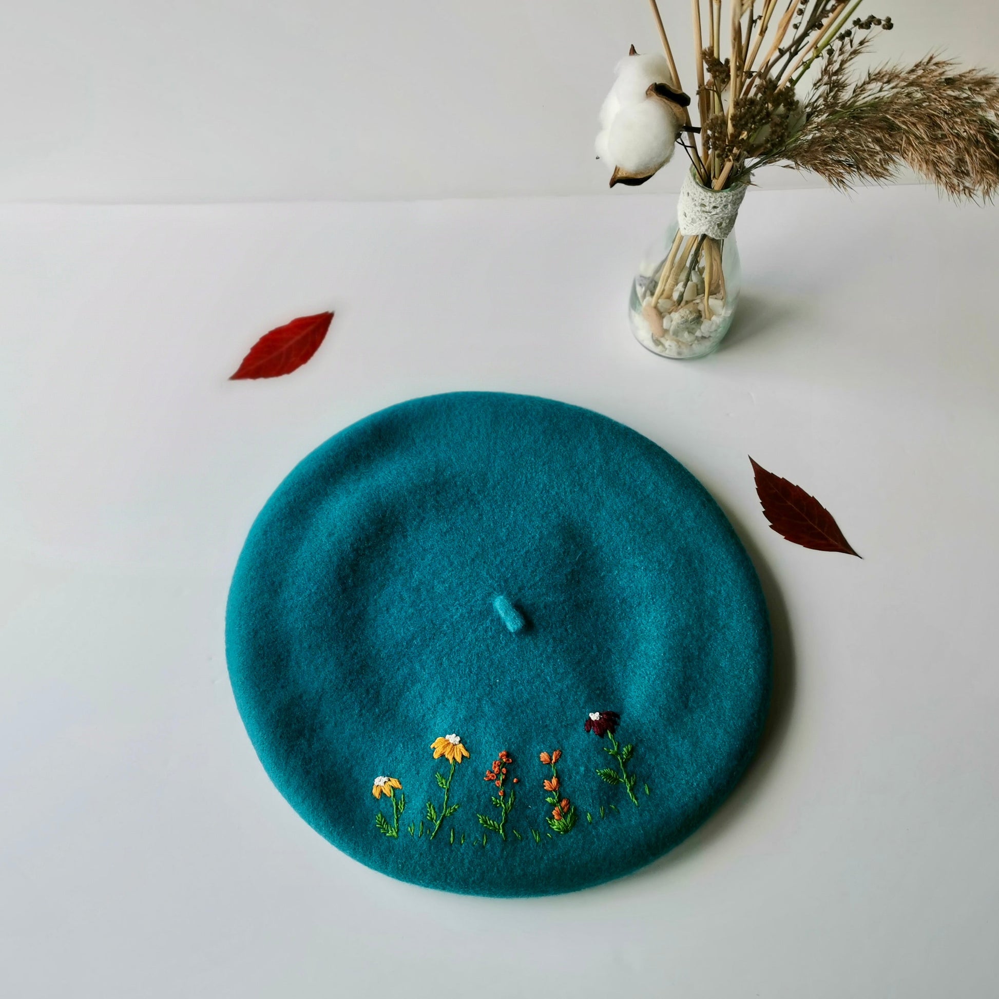 Beretă turcoaz deschis brodată manual cu flori de toamnă