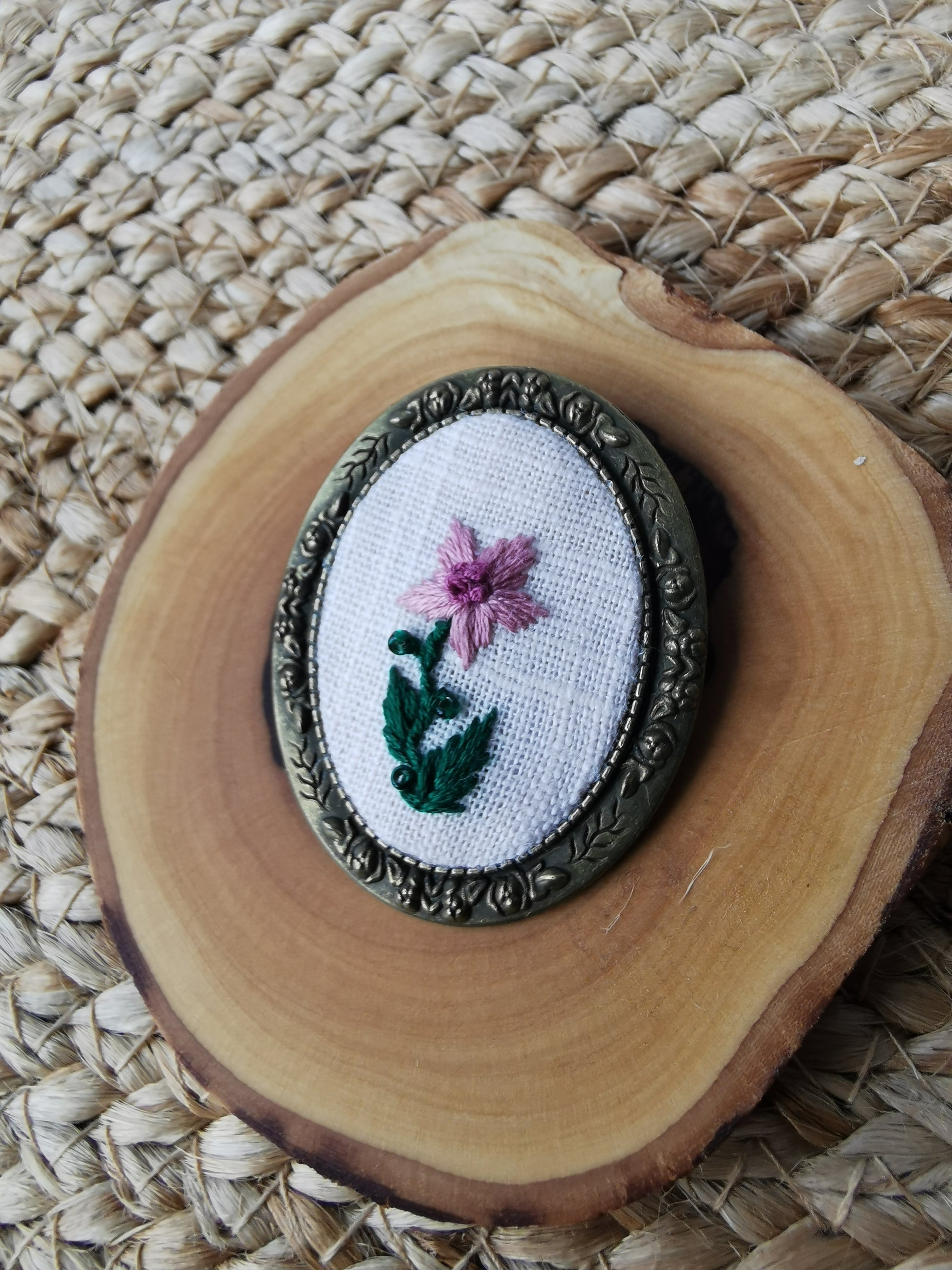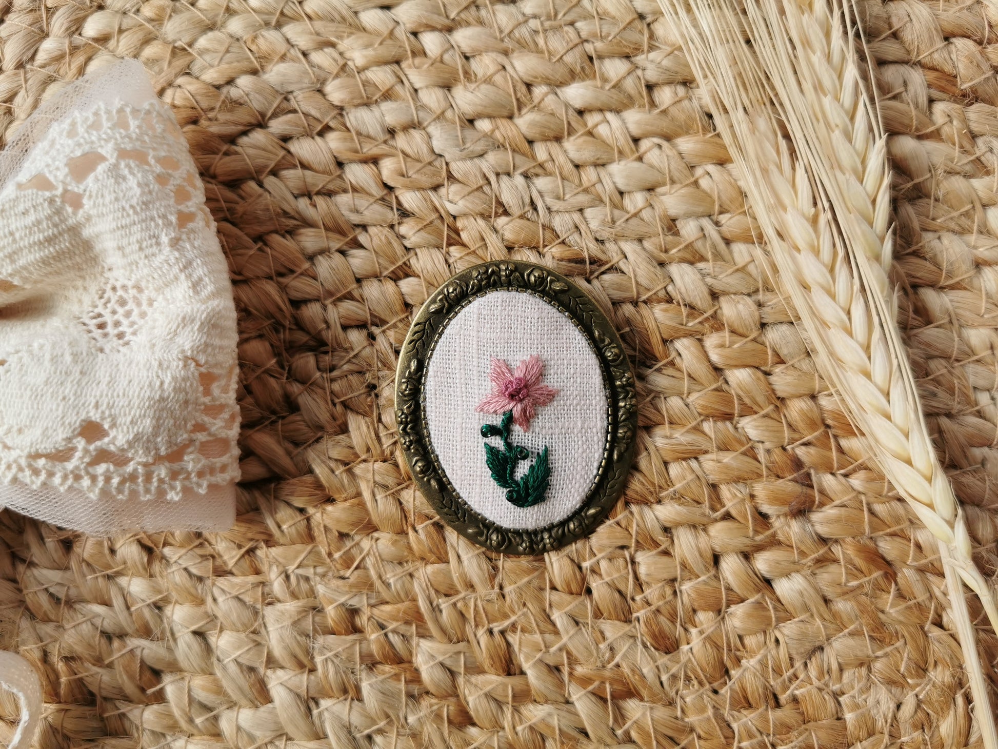 Brosă vintage brodată manual pe in cu floare roz şi mărgele, baza acesteia este din metal, culoarea bronzului.