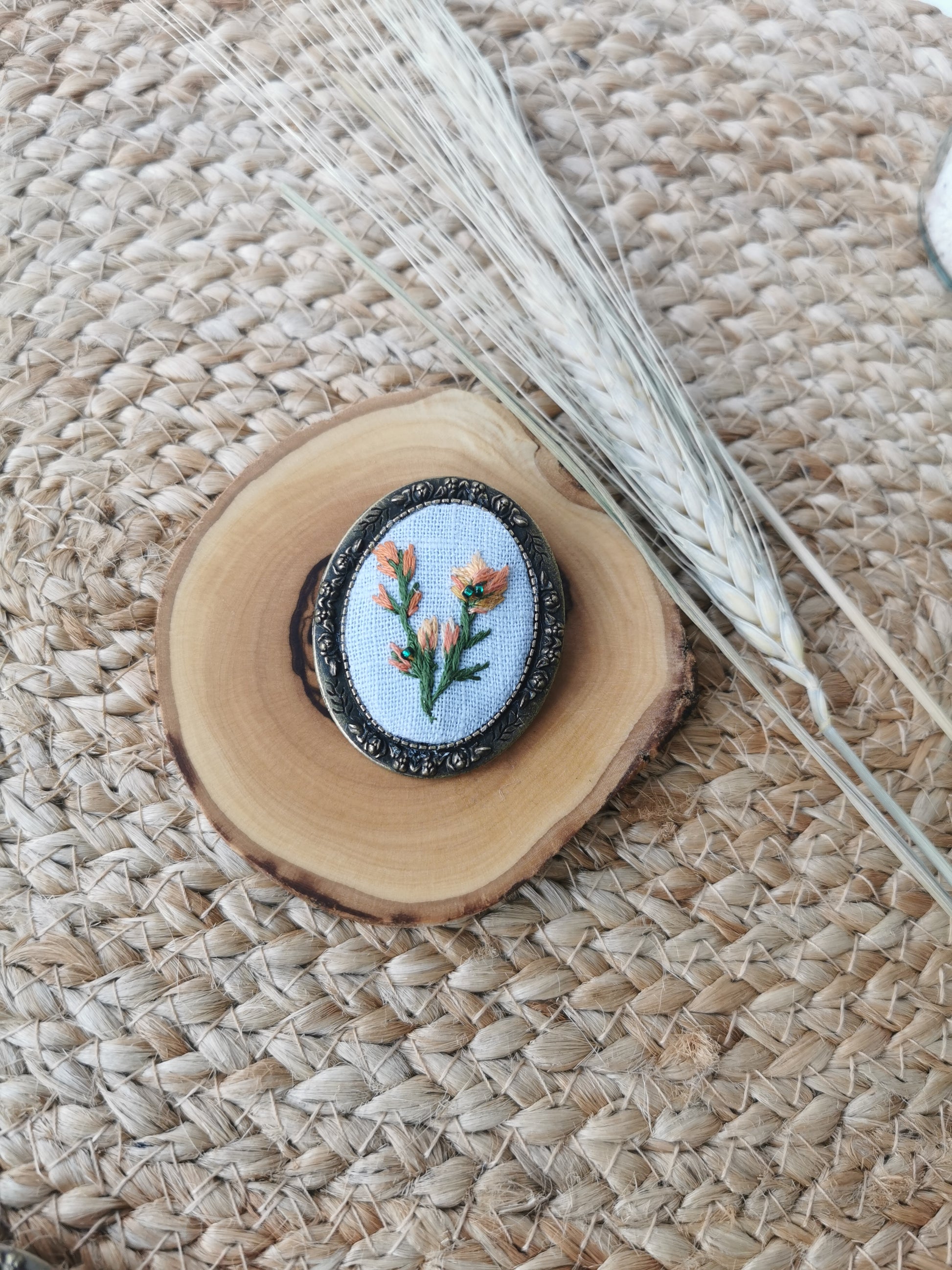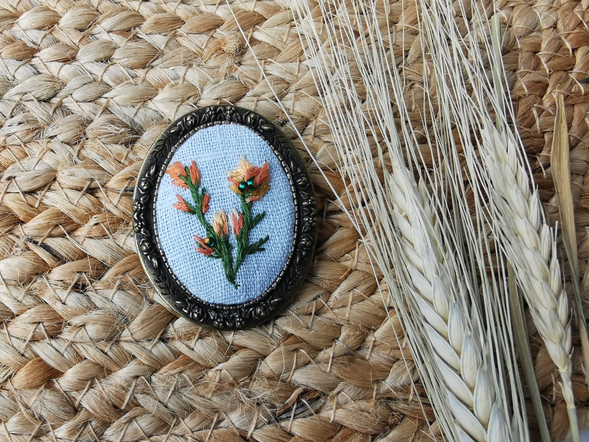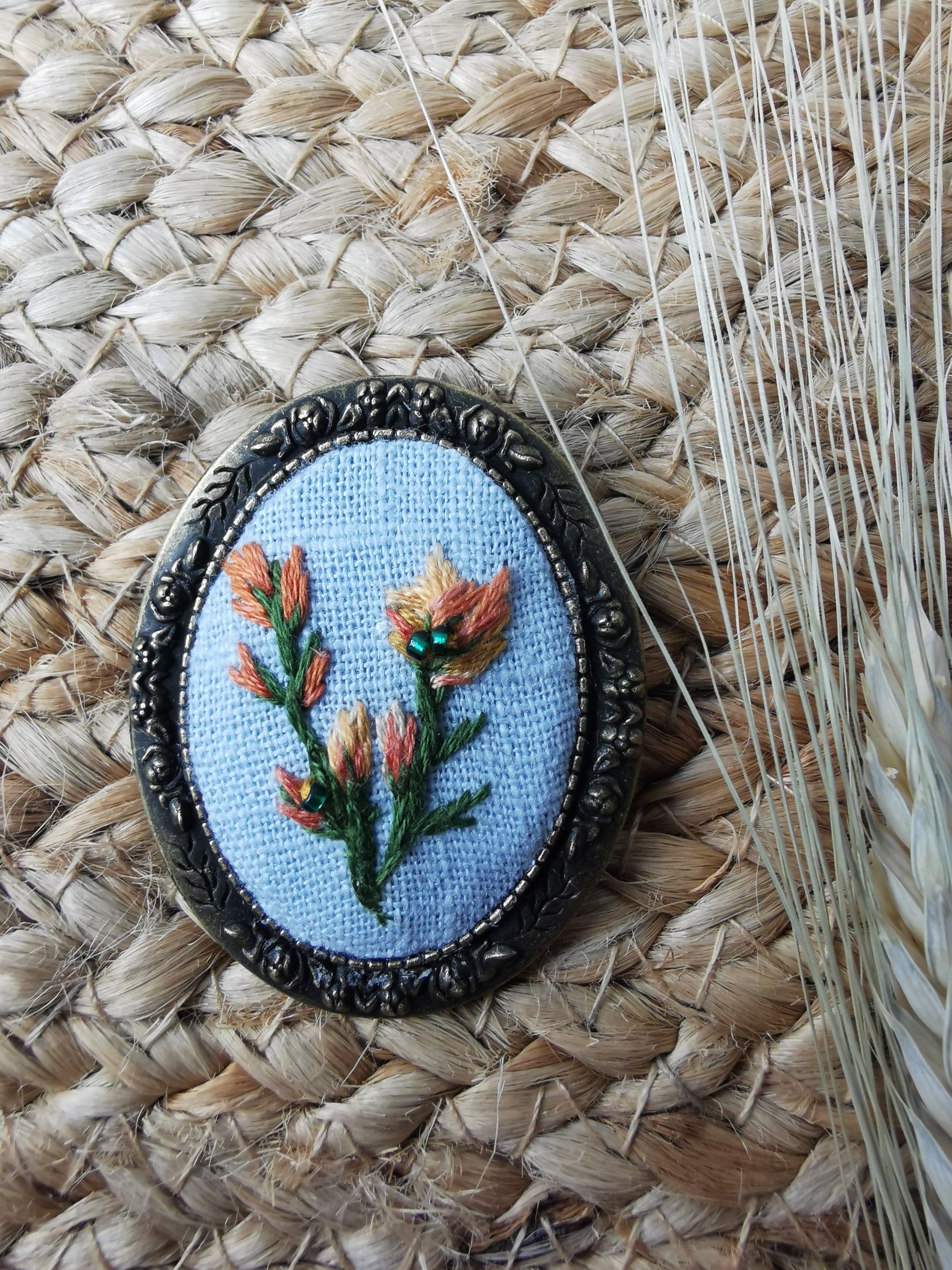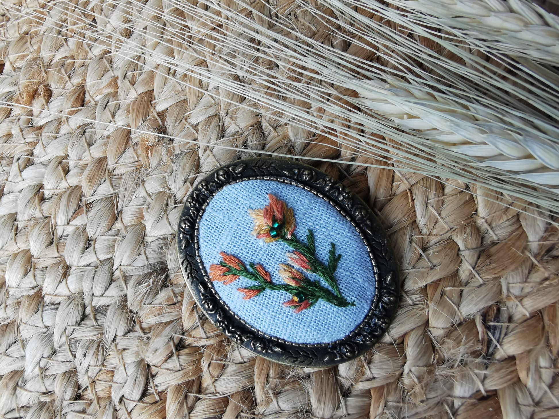 Broşă vintage brodată manual pe in albastru cu flori cărămizii şi mărgele, baza acesteia este din metal, culoarea bronzului.