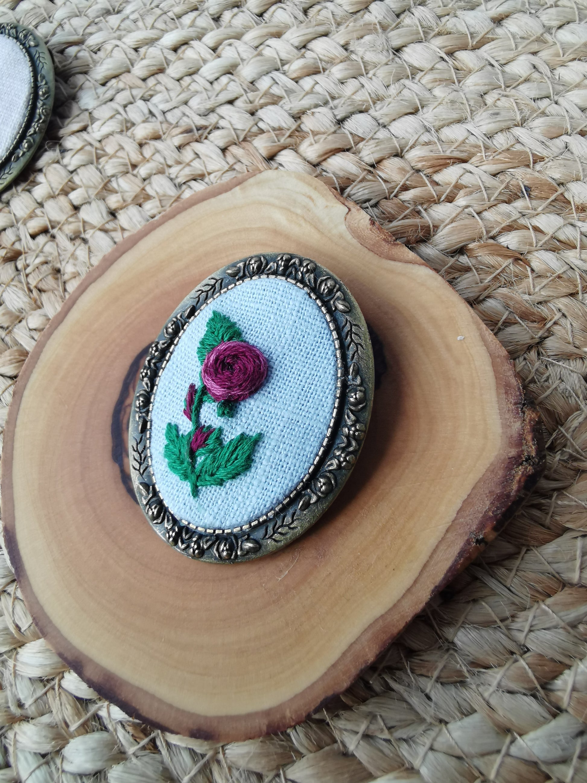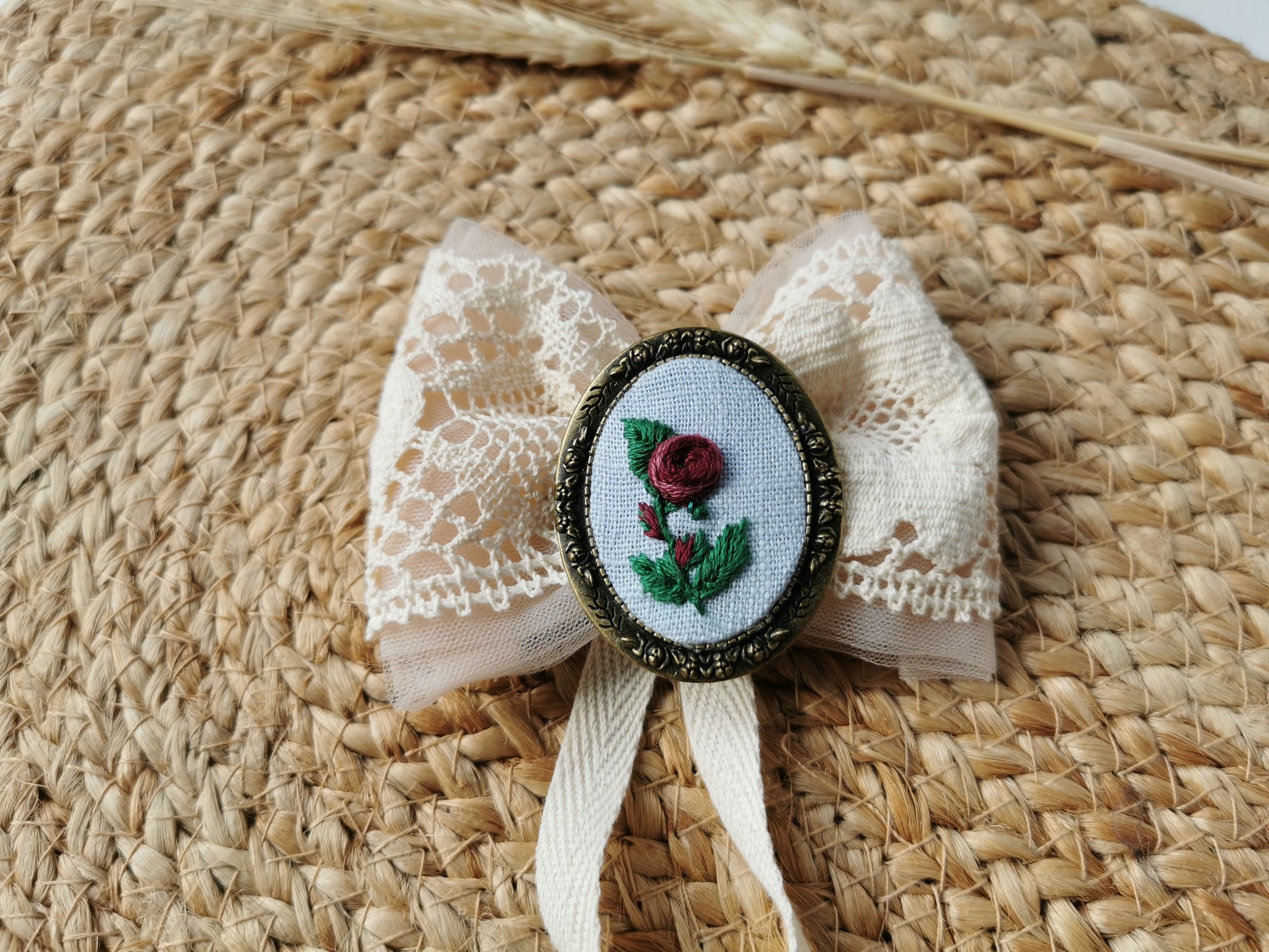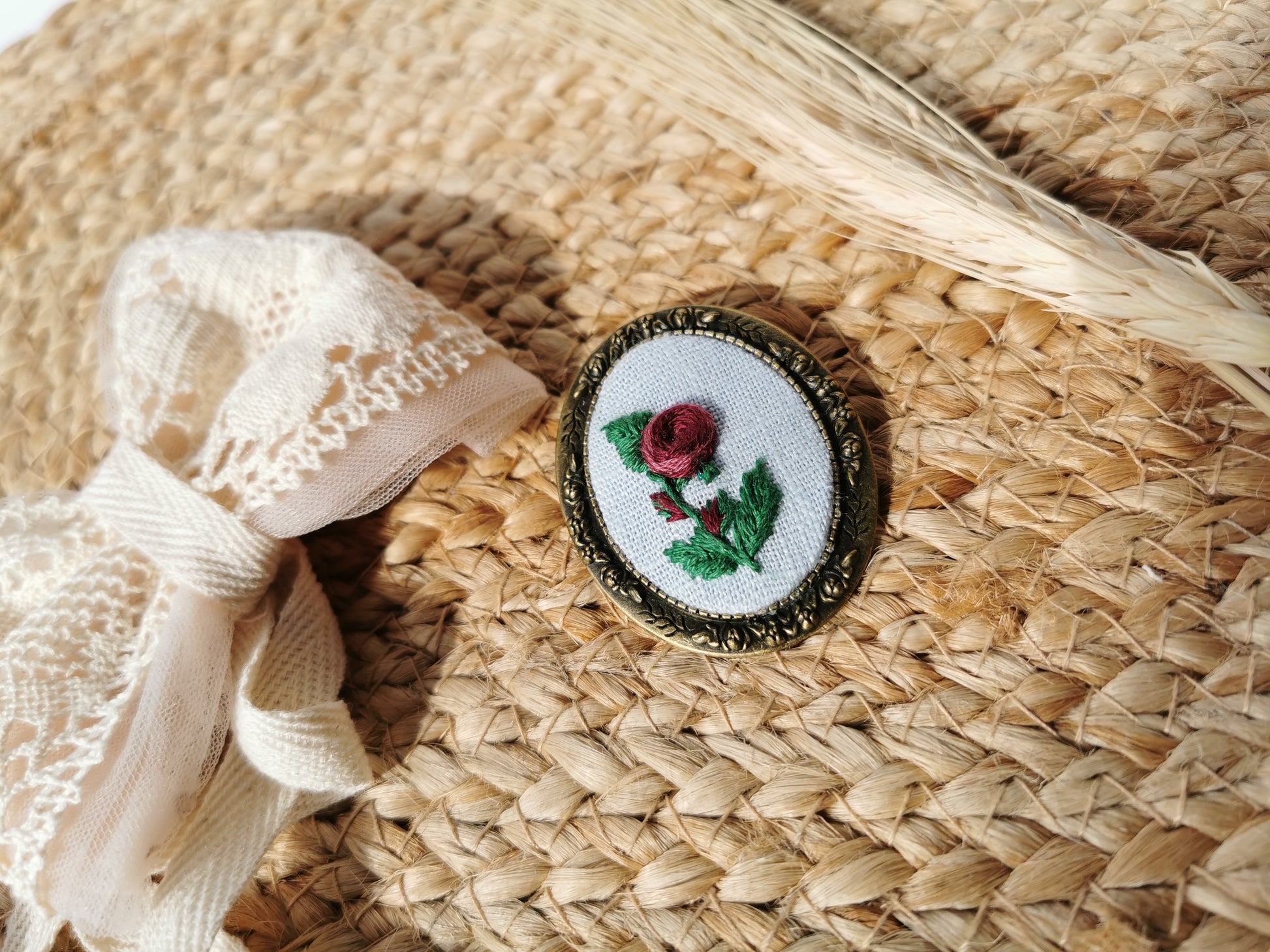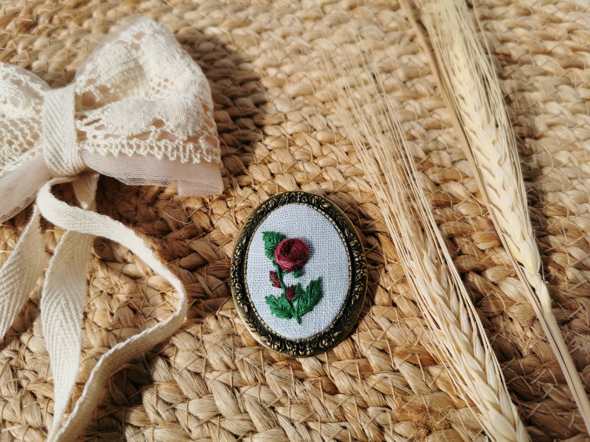 Broşă vintage brodată manual pe in albastru cu trandafir bordeaux şi mărgele, baza acesteia este din metal, culoarea bronzului.