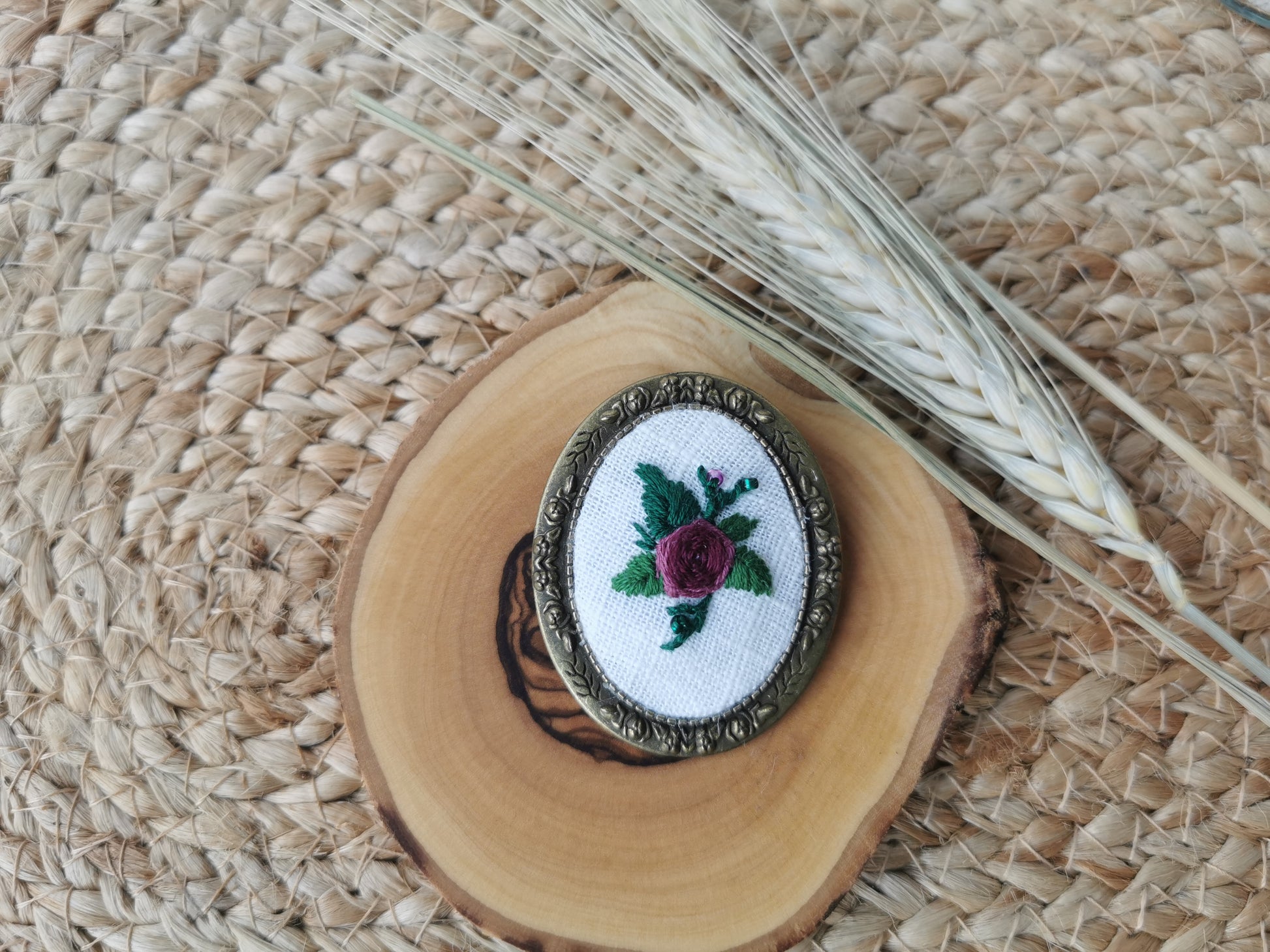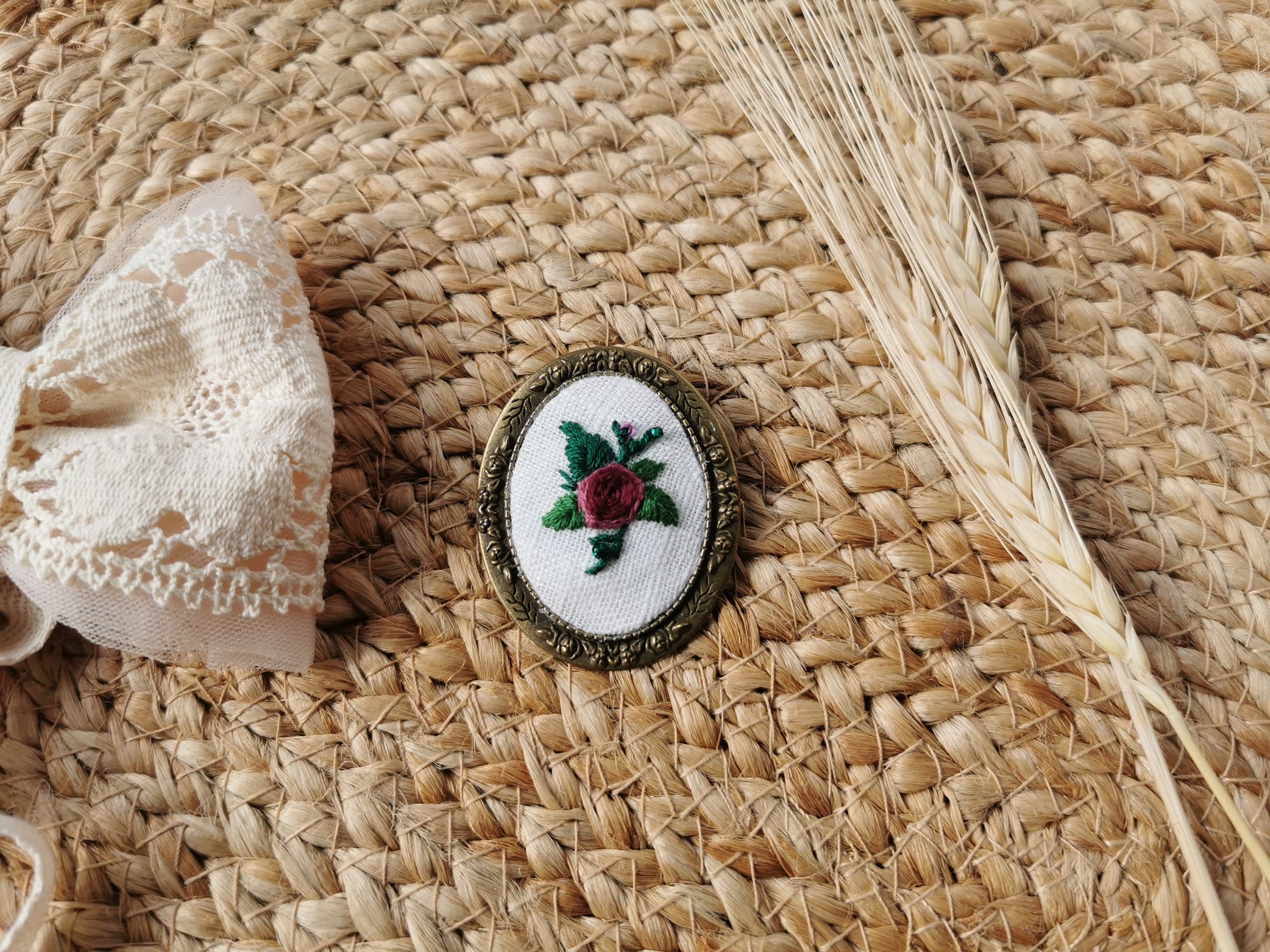 Broşă vintage brodată manual pe in alb cu trandafir vişiniu şi mărgele, baza acesteia este din metal, culoarea bronzului.