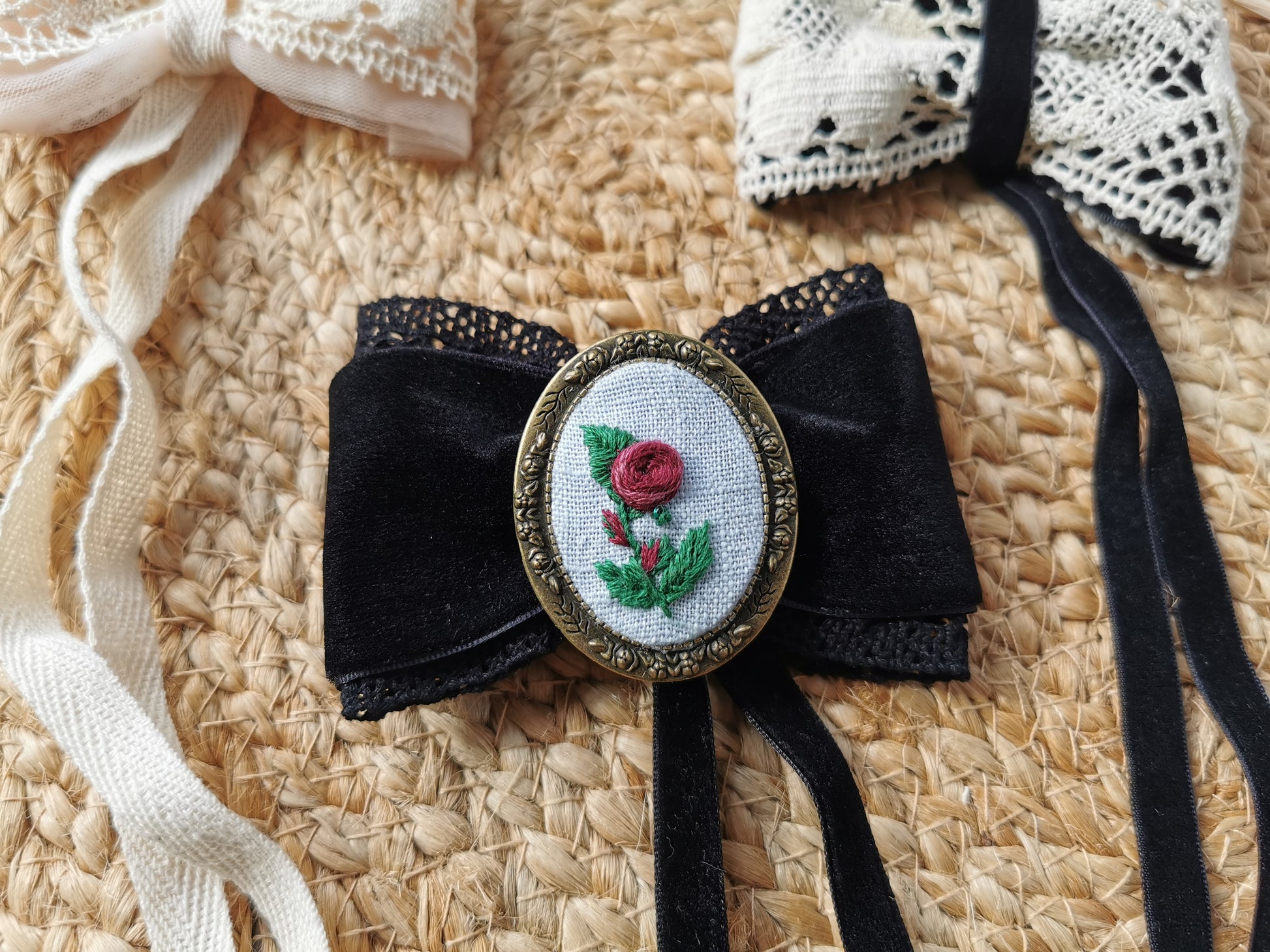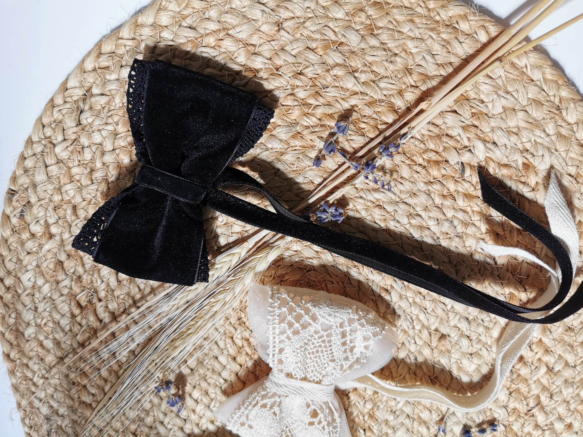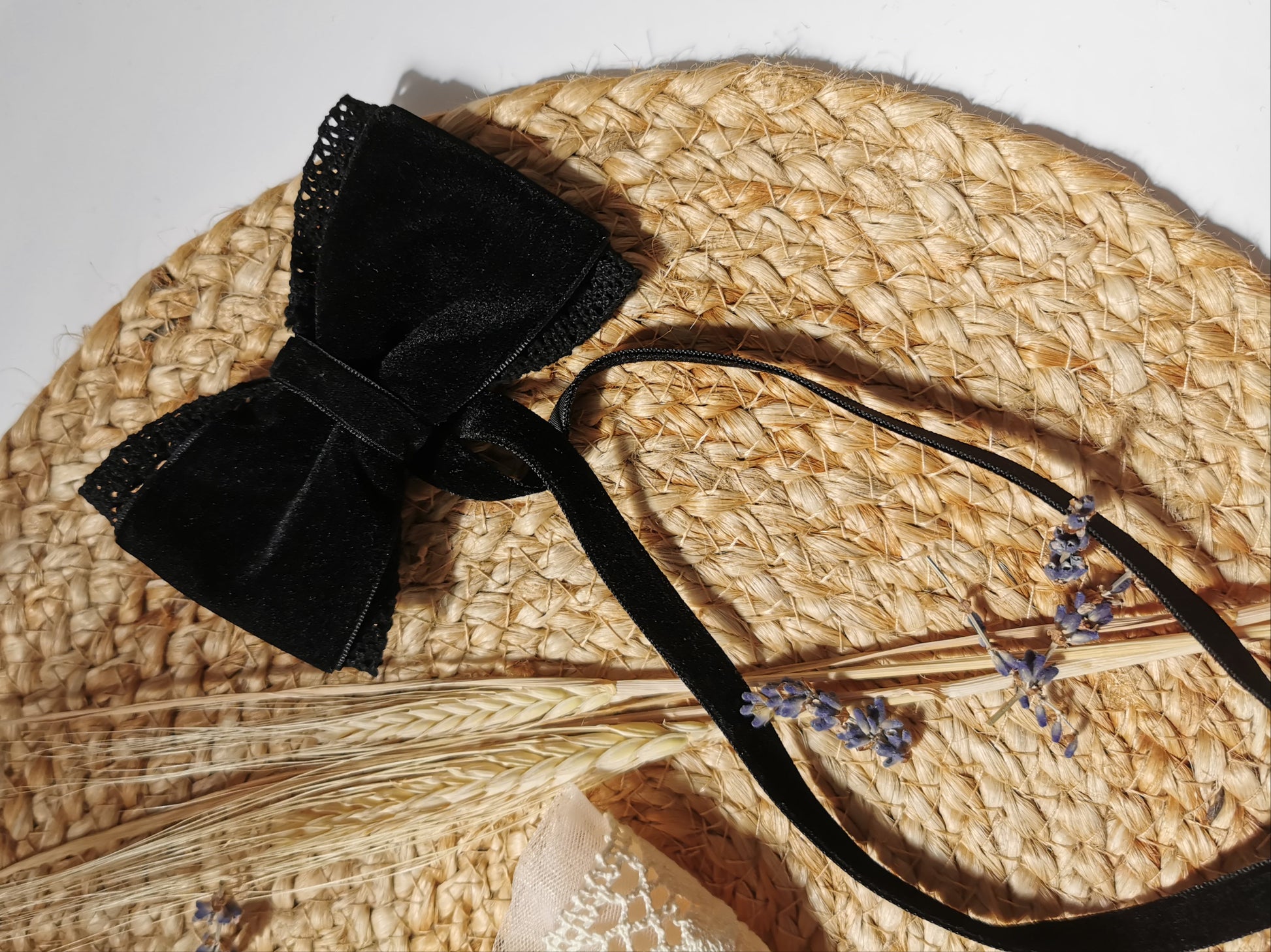 Fundă stil vintage Amy confecţionată manual din catifea şi dantelă neagră. Acesta are ataşată o prinzătoare din oţel inoxidabil pentru haine, accesorii etc. Acesta se potriveşte cu broşele din noua colecţie dar şi cu alte tipuri de broşe.