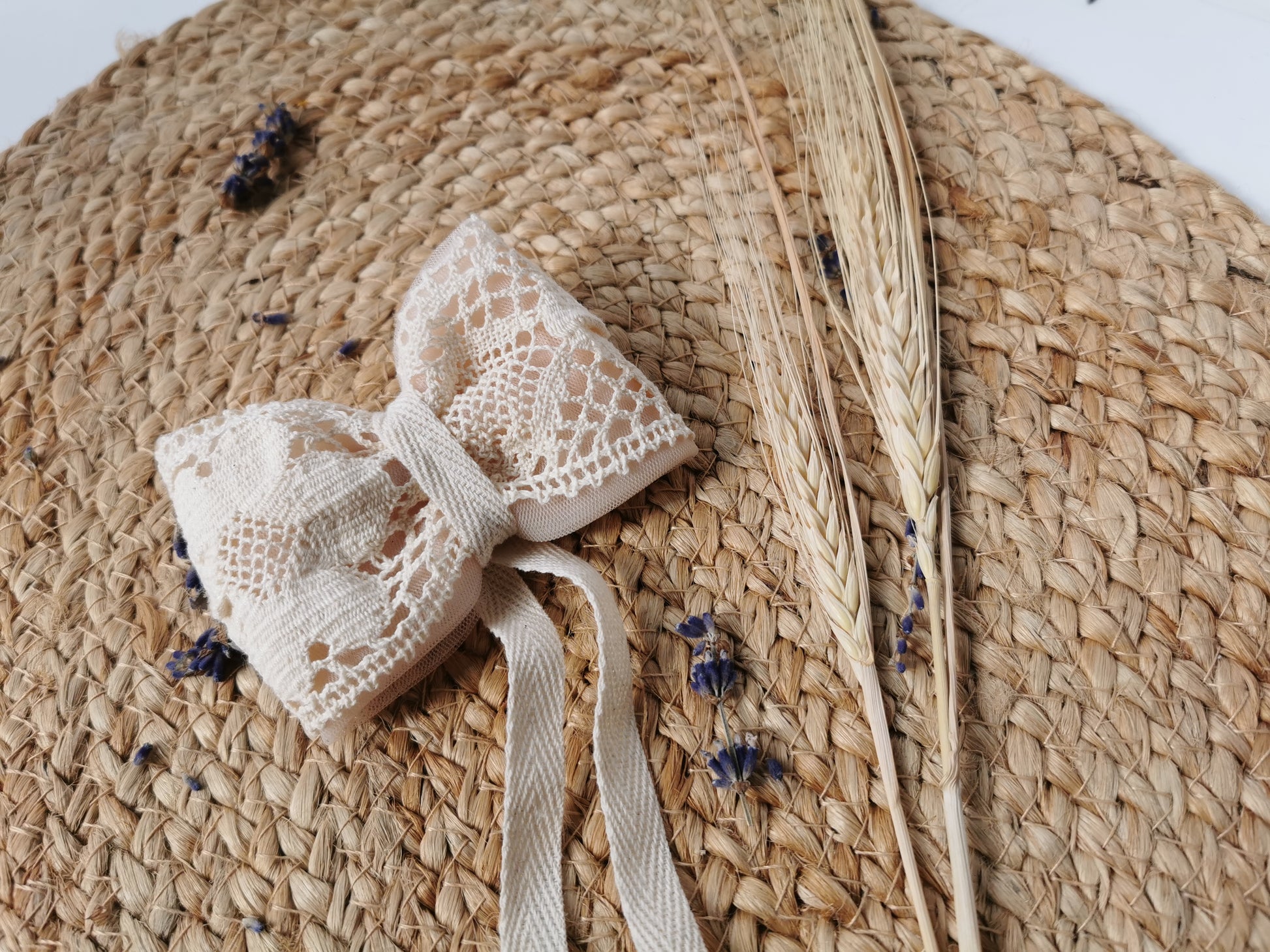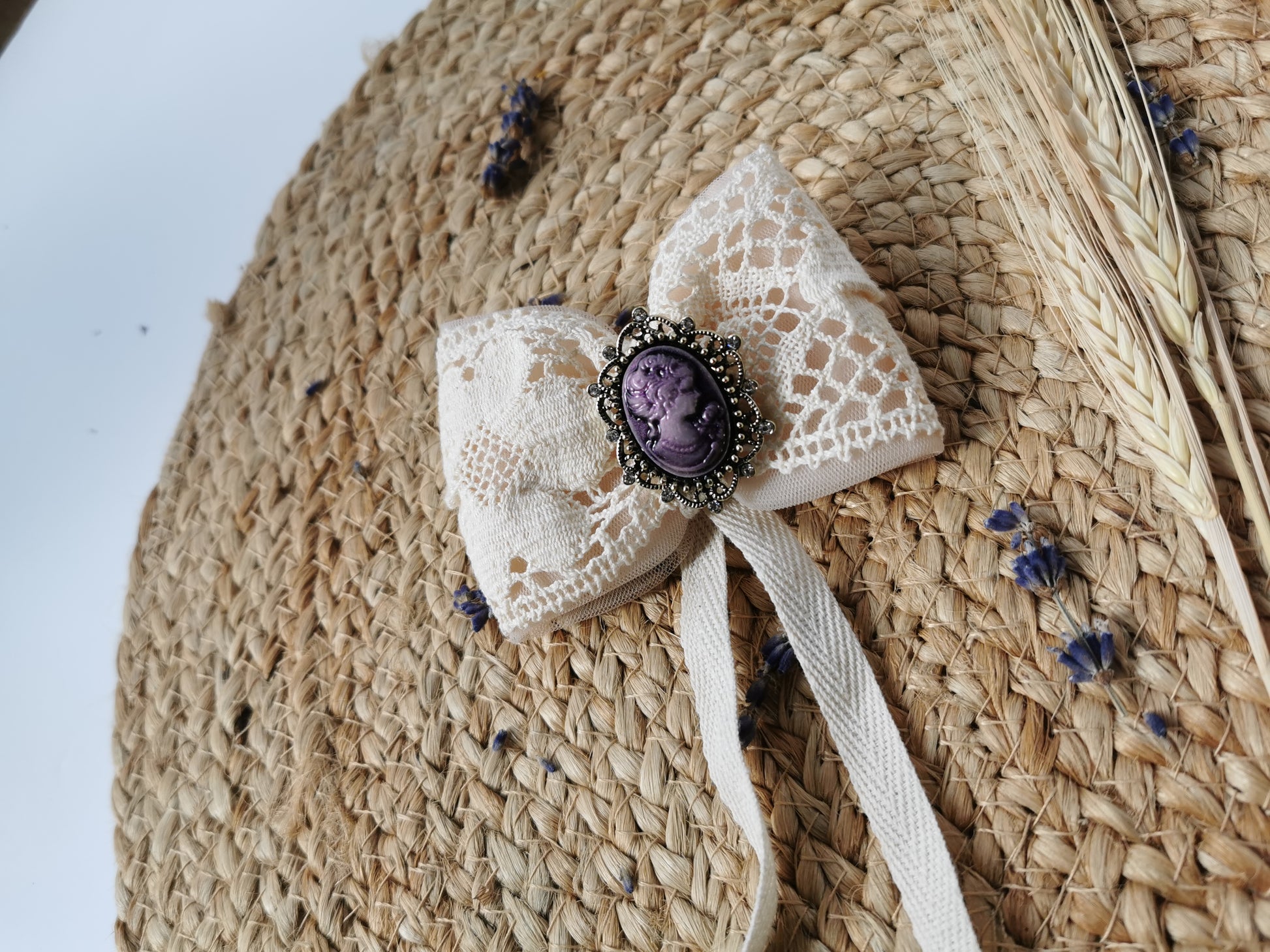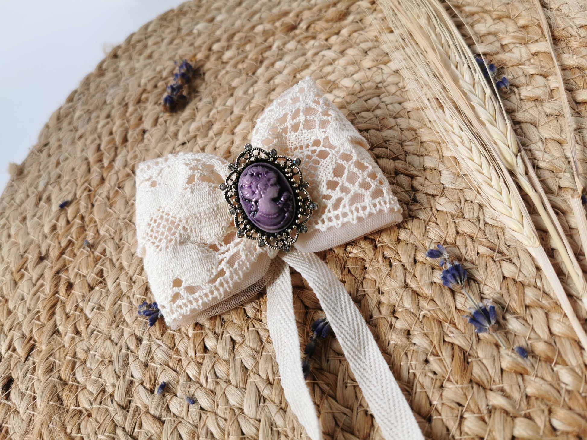 Fundă stil vintage Margaret confecţionată manual din dantelă crem din bumbac şi tulle roz. Acesta are ataşată o prinzătoare din oţel inoxidabil pentru haine, accesorii etc. Ea se potriveşte cu broşele din noua colecţie dar poate fi purtată şi fără broşă.