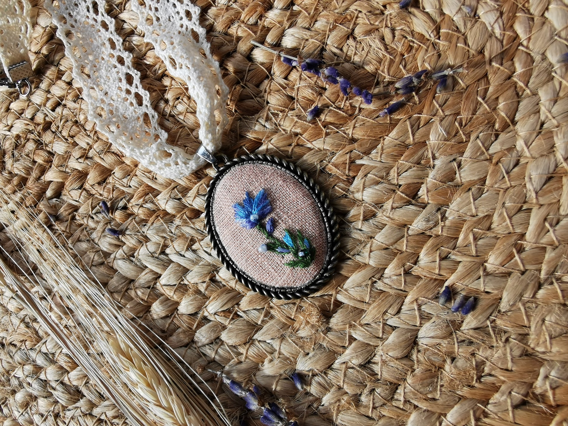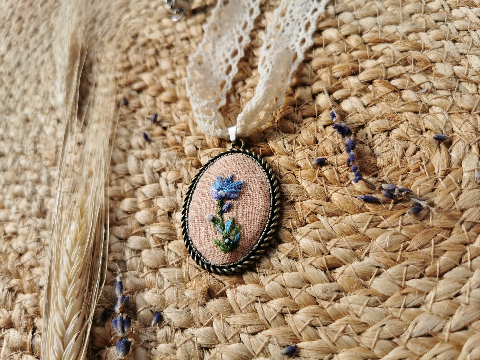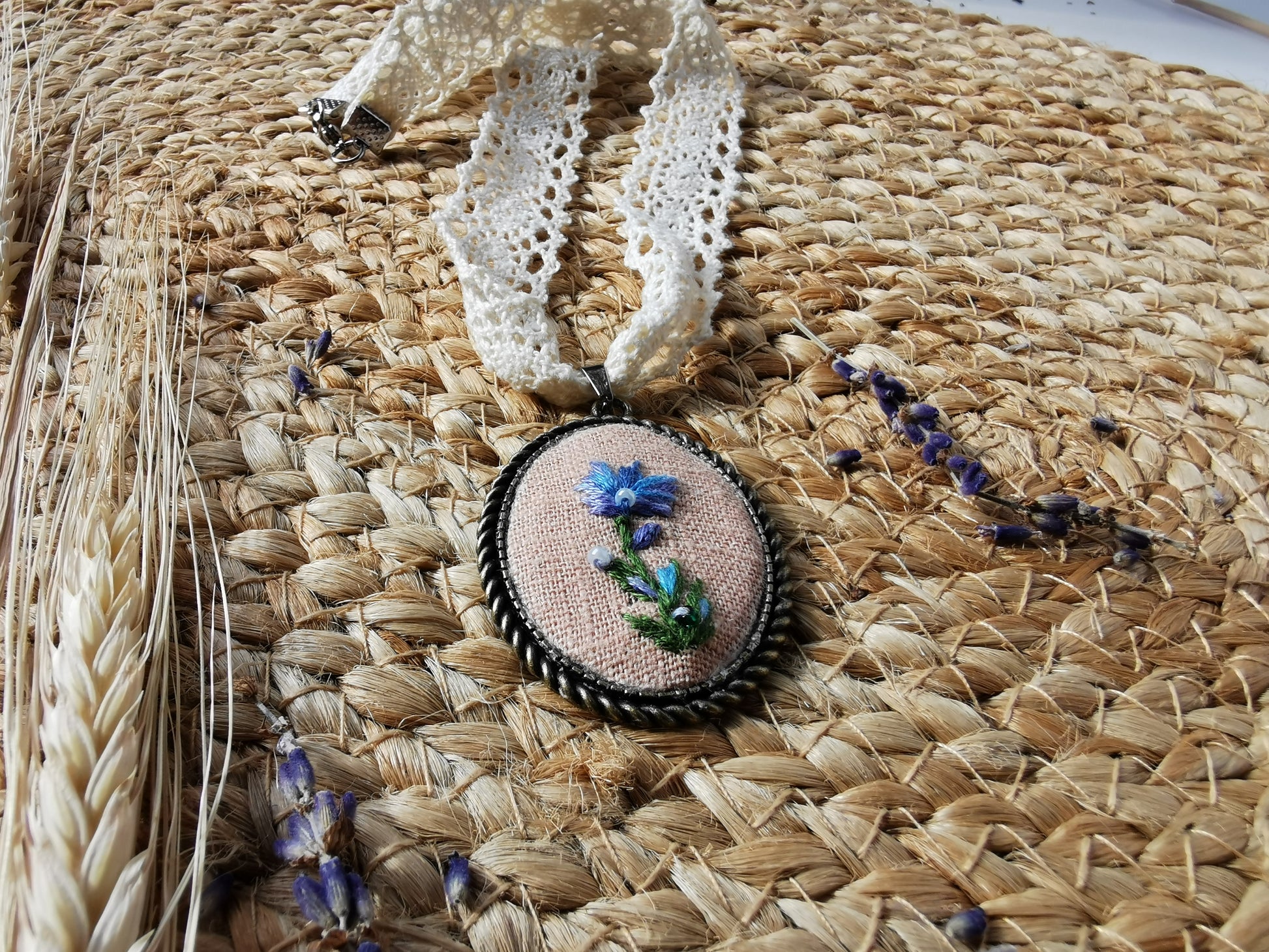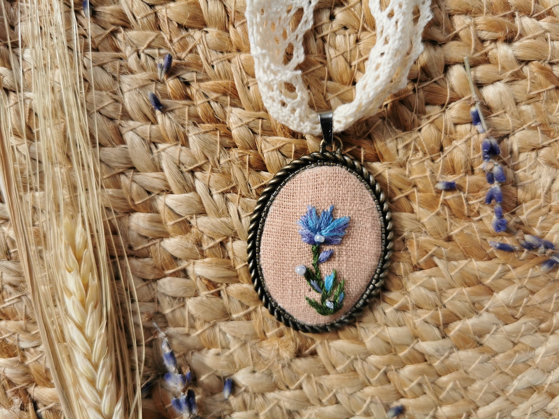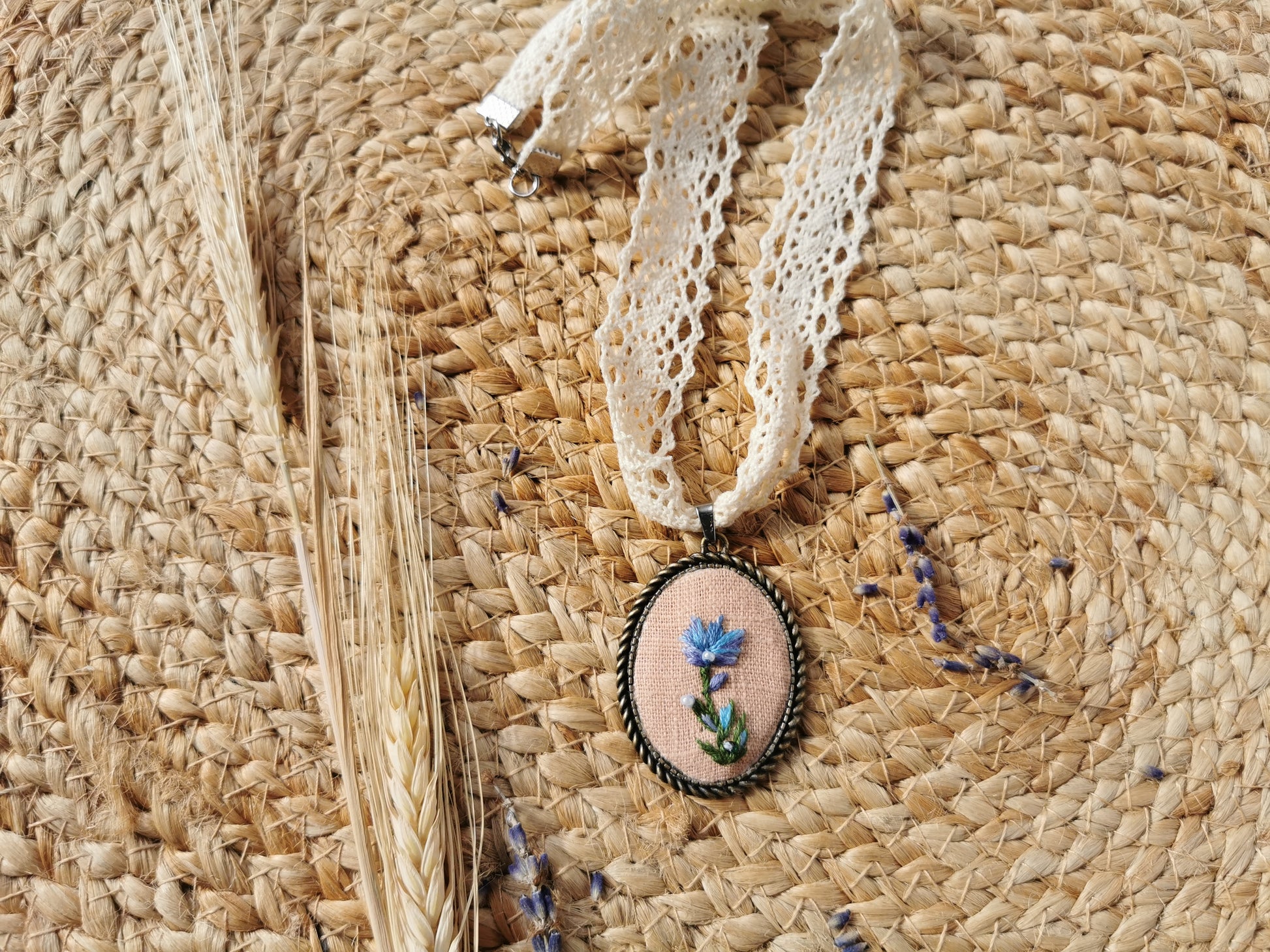 Pandativ vintage brodat manual pe in roz somon cu floare albastră şi mărgele, baza acestuia este din metal, culoarea bronzului. Acesta are ataşată o dantelă de bumbac şi închizători din oţel inoxidabil.