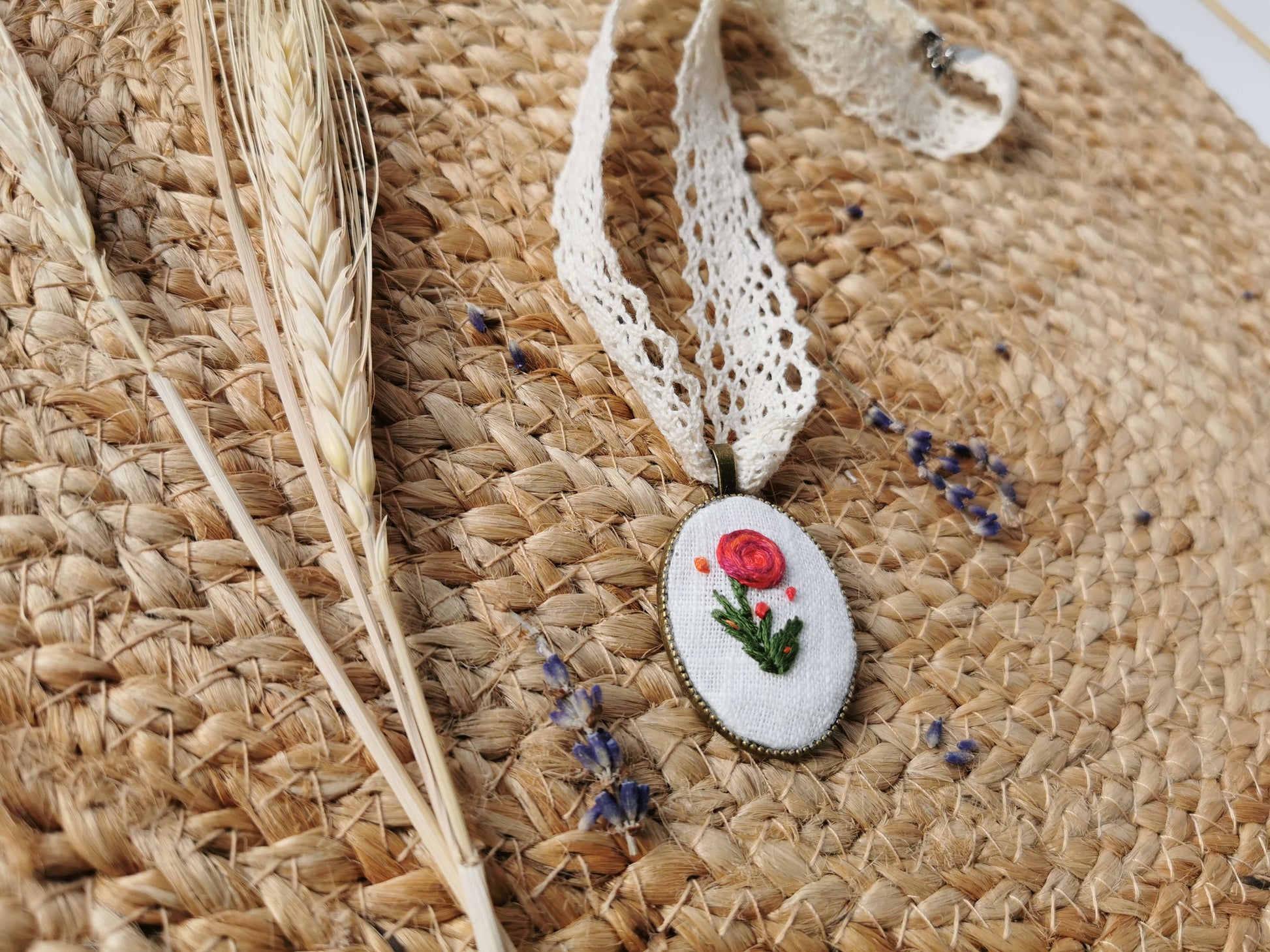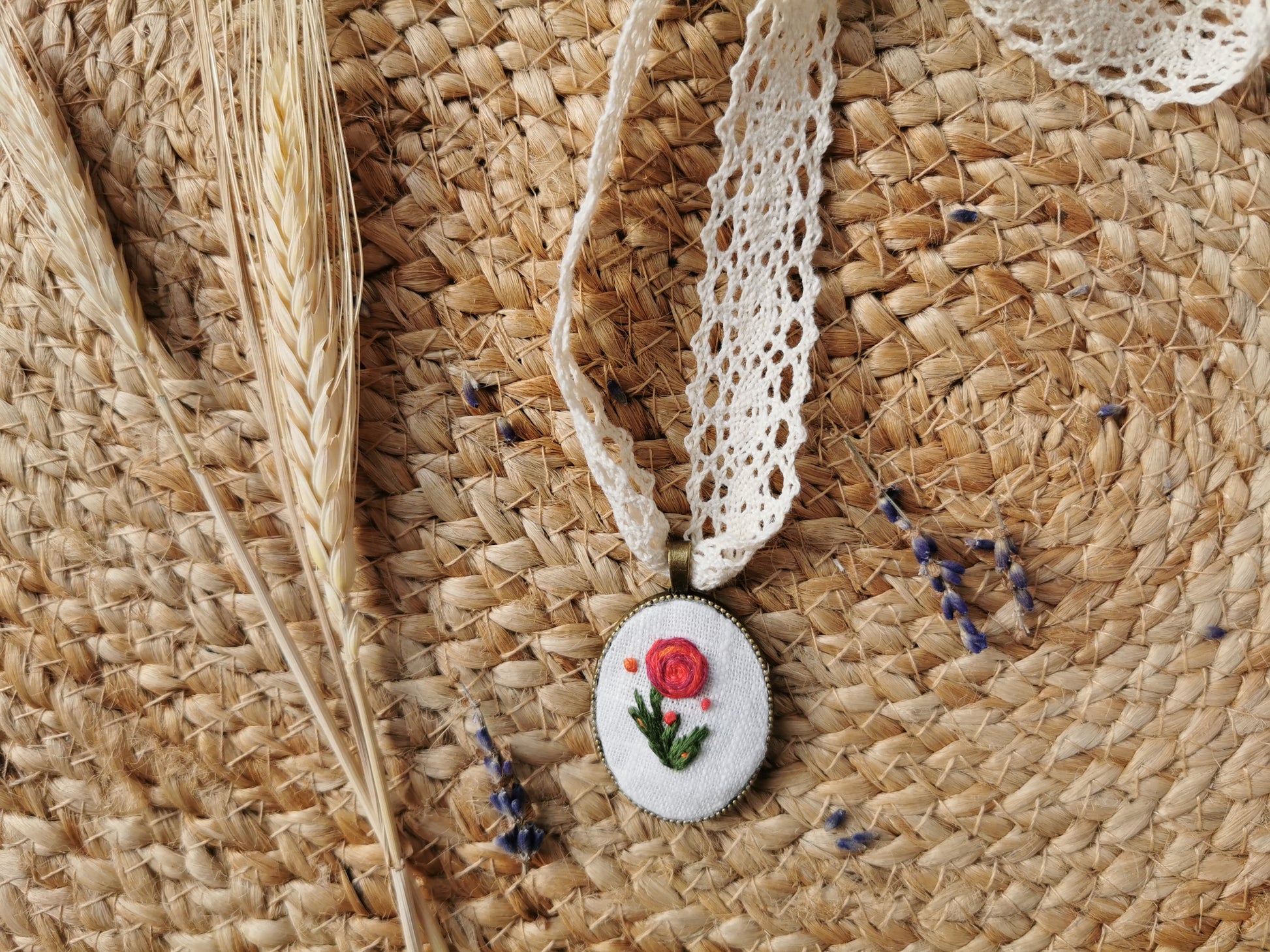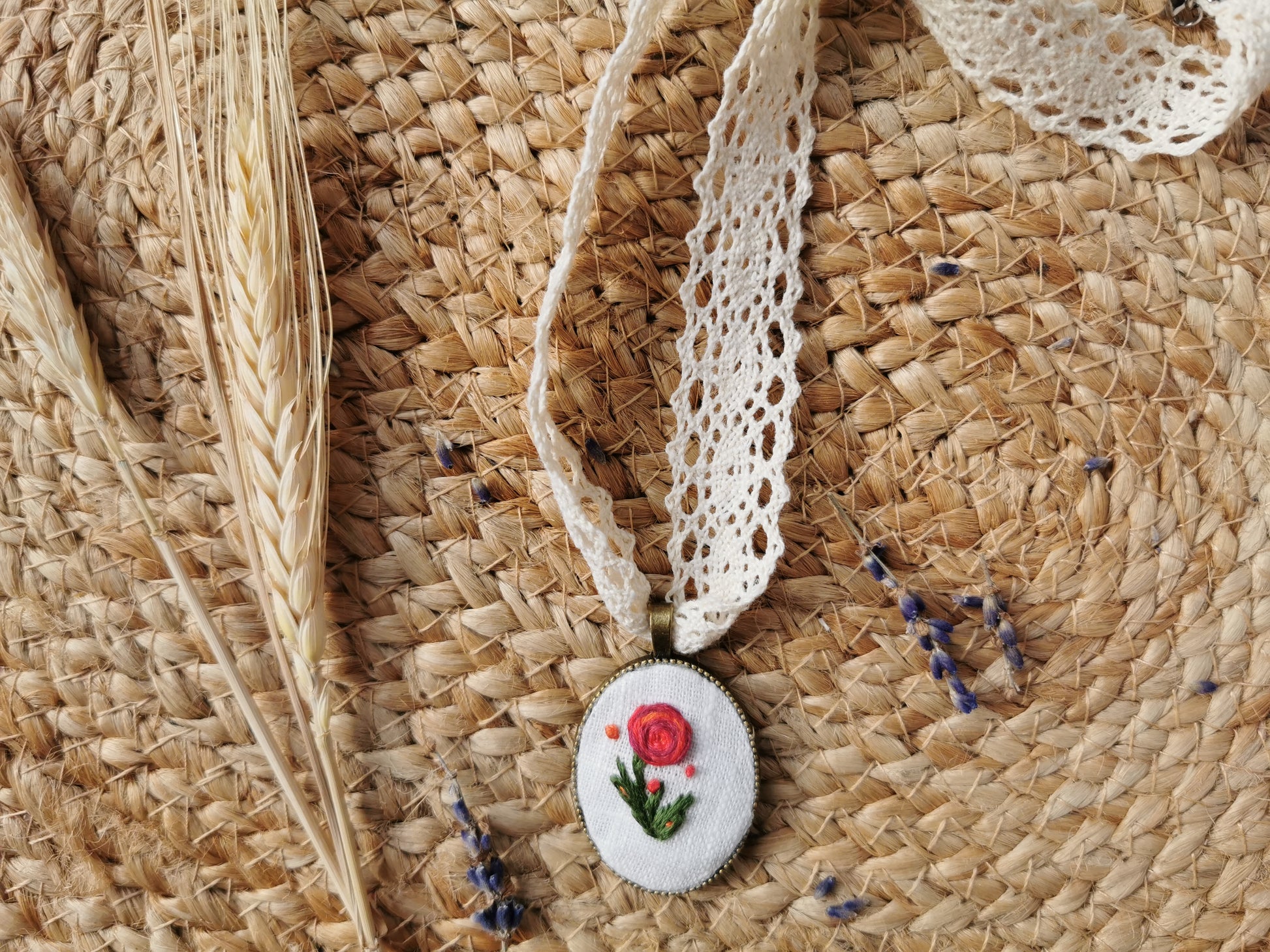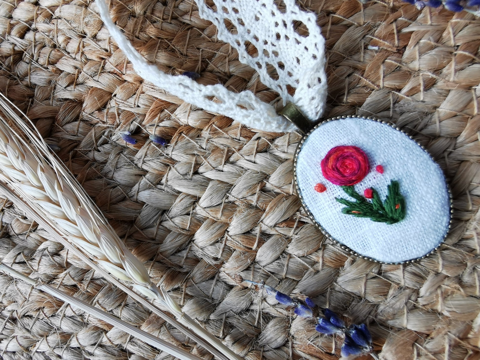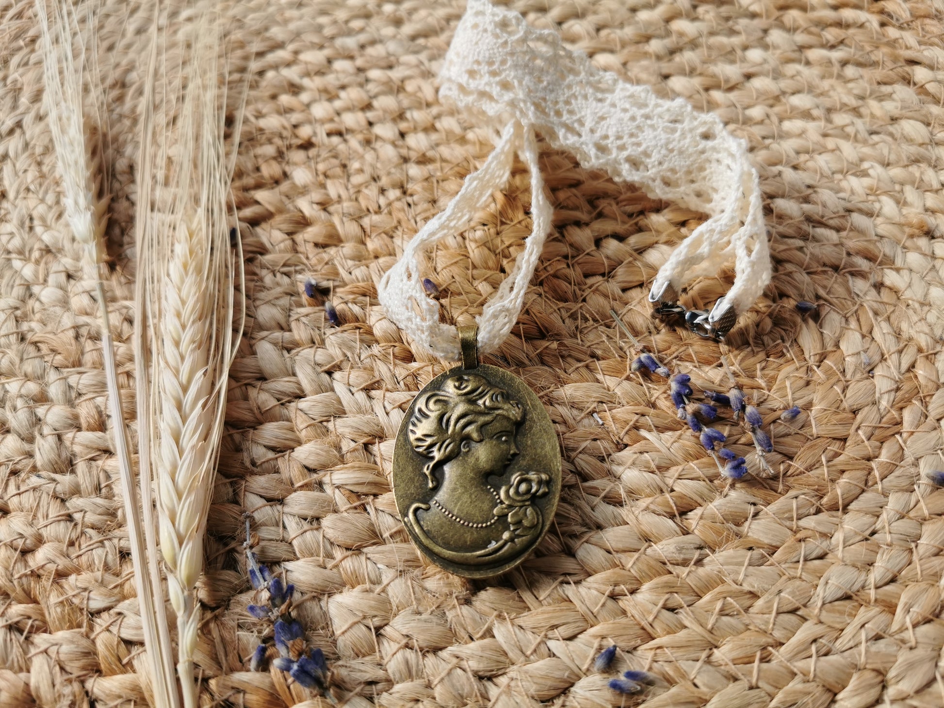 Pandativ vintage brodat manual pe in alb cu trandafir şi mărgele, baza acestuia este din metal, culoarea bronzului. Acesta are atasată o dantelă de bumbac şi închizatori din otel inoxidabil. Pe cealaltă parte are o camee.