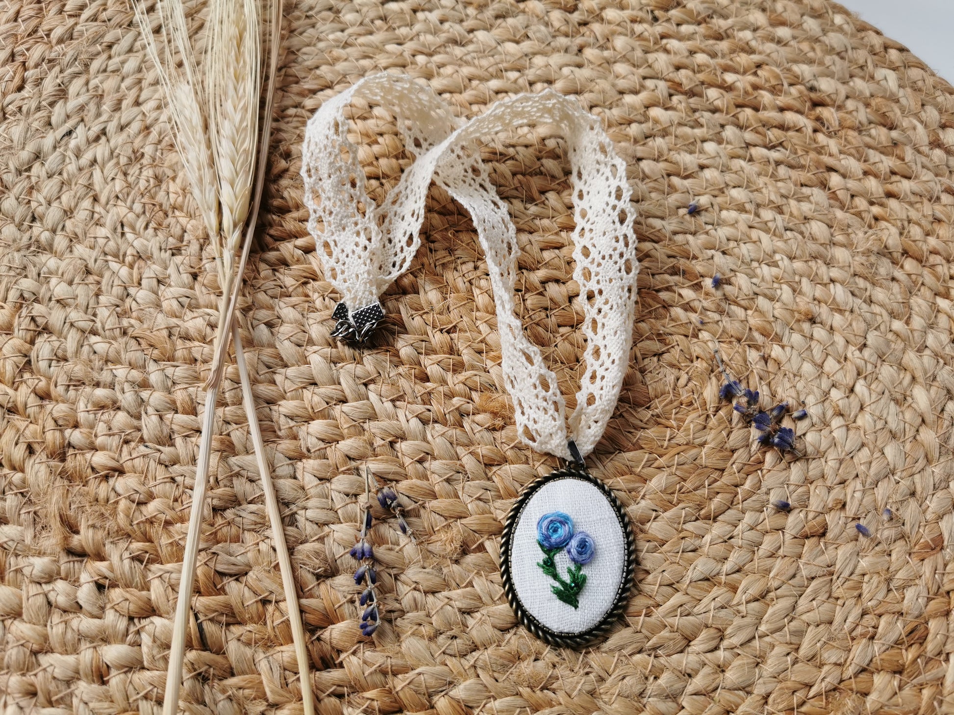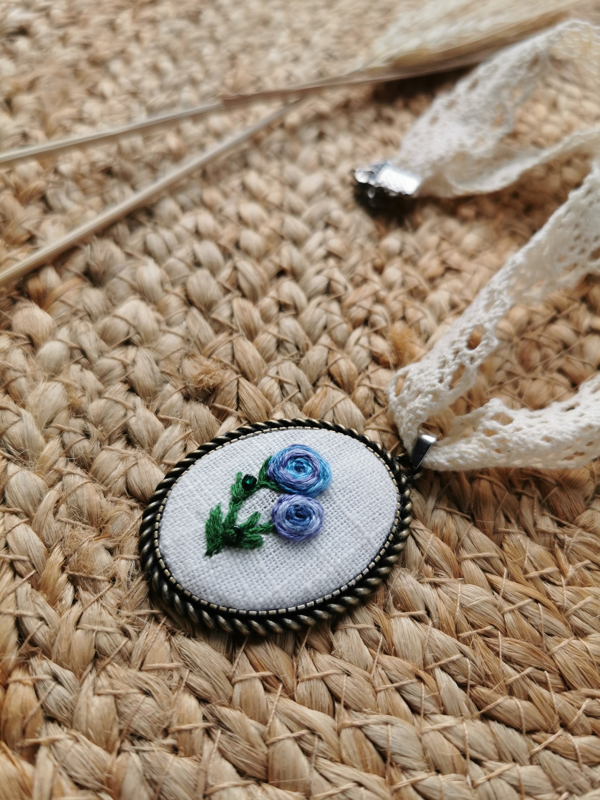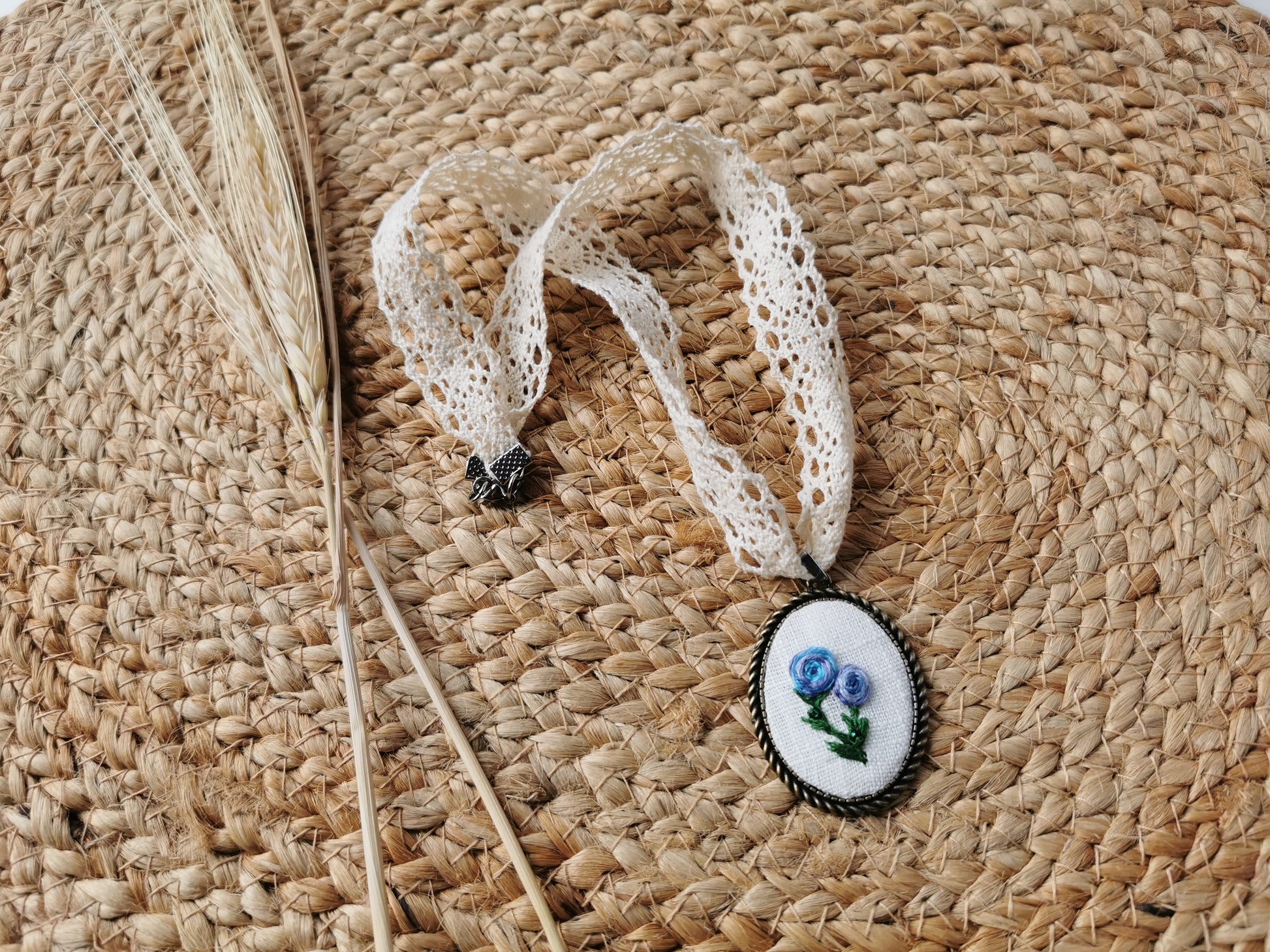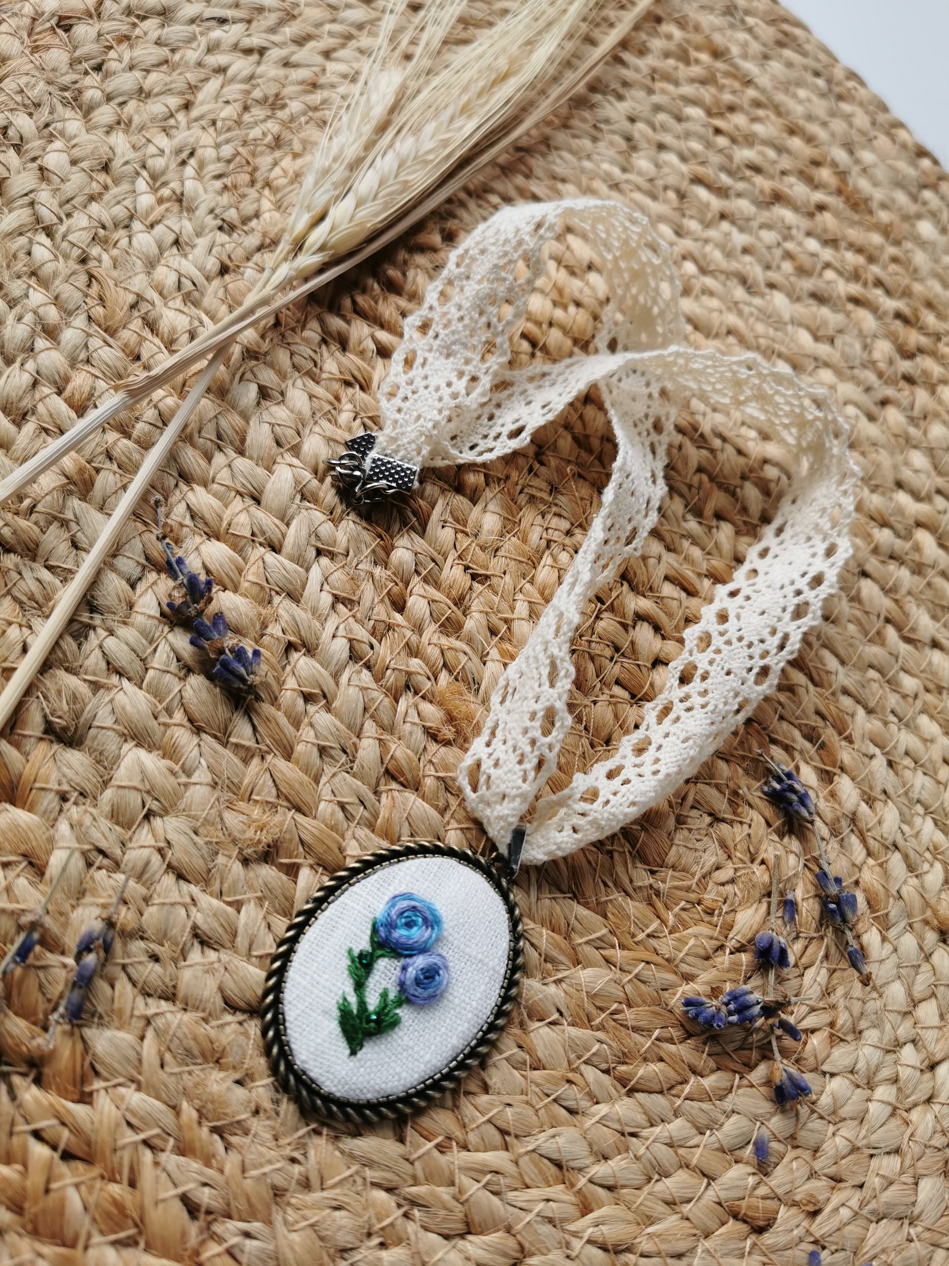 Pandativ vintage brodat manual pe in alb cu trandafiri mov şi mărgele, baza acestuia este din metal, culoarea bronzului. Acesta are ataşată o dantelă de bumbac şi închizători din oţel inoxidabil.