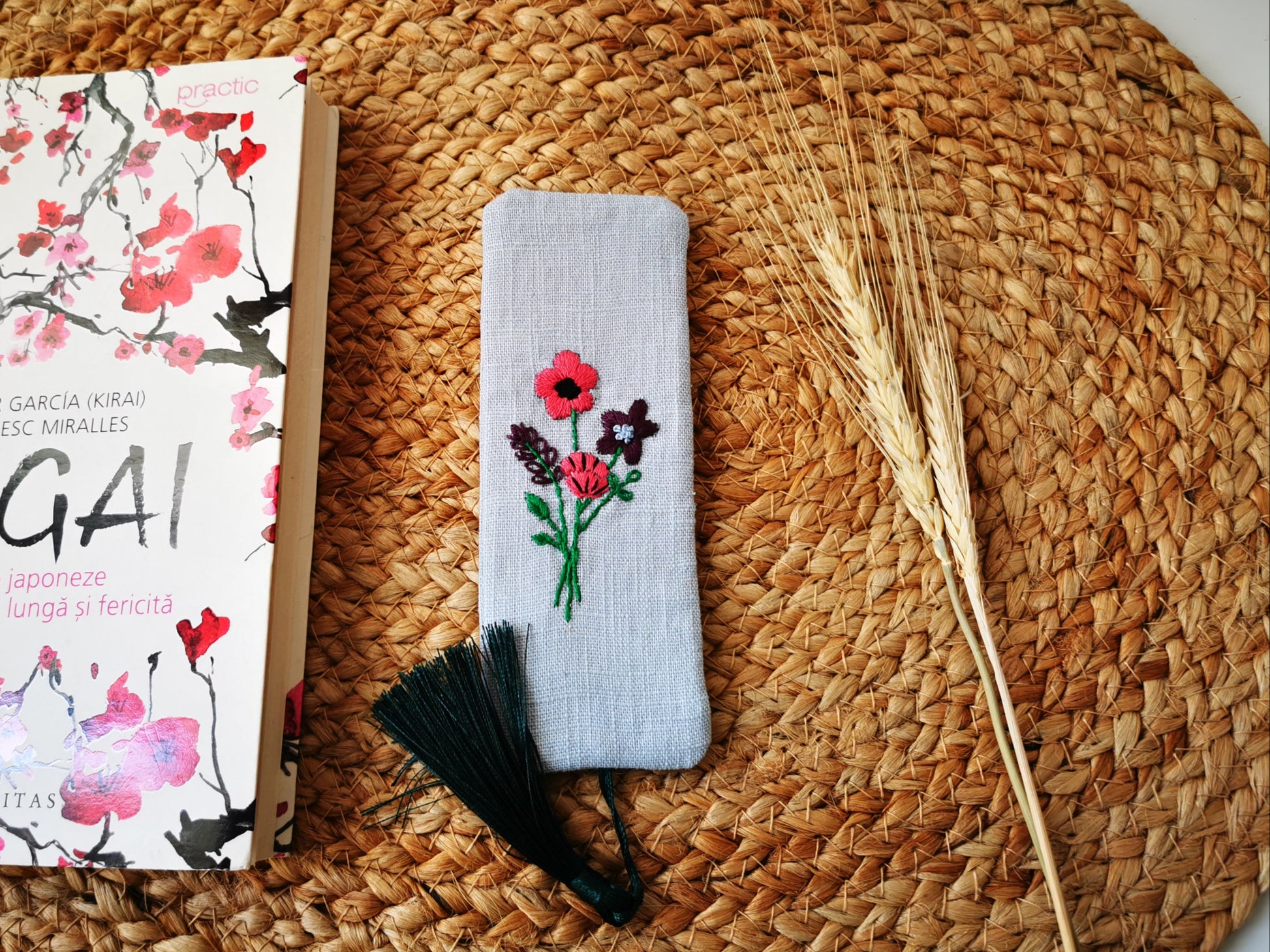 Semn de carte unicat brodat manual cu buchet de flori roz din in cu fir de bumbac, dimensiuni: înălţime 14 cm şi lăţime 5 cm.